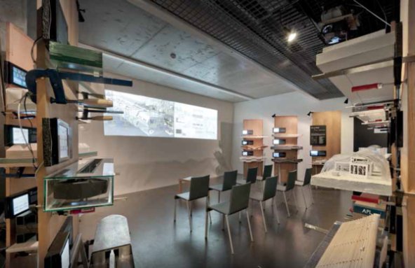 Plány prezentujeme ve společném portfoliu, kde jsou všechny výkresy, technické detaily a texty. Můžete si knihou listovat tak dlouho, jak je to nutné k nastudování projektu. Hlavní téma ateliéru prezentujeme naopak jako jeden celek. Na velkoplošné projekci jsou představeny koncepty prací. Na stěnách nebo na stole jsou umístěny modely doplněné malými obrazovkami s podrobnými informacemi.