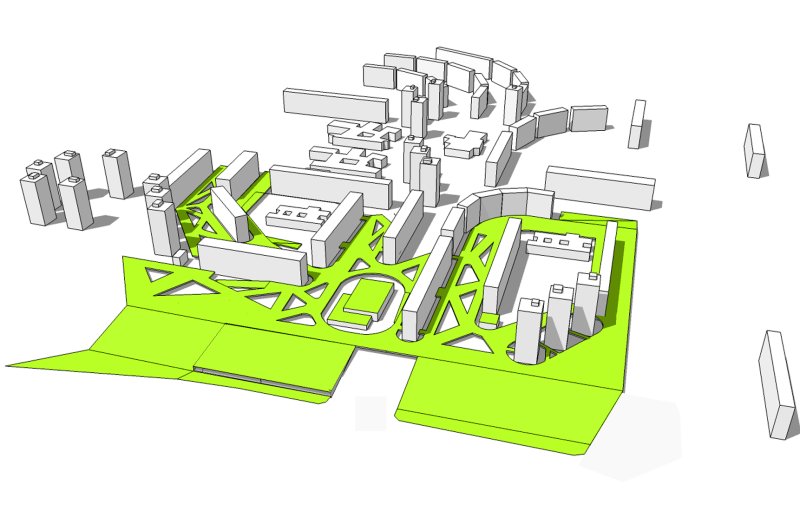 The KVP residential area is nowadays a labyrinth of living area, roads, sidewalks, and parking supplemented by green. This system puts pedestrians into the position where they come into constant contact with cars and their free movement is permanently obstructed. My intervention aims to change this situation in favour of pedestrians as well as to add more greenery into the concrete jungle. It should create an area where people can relax, do sports or just walk without being obstructed by transport or other negative effects. I created a second floor above the original surface which would be completely green and on the original surface would be only roads and static transport which will of course raise its capacity.