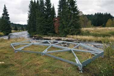The room in landscape, Modrava village in the Bohemian Forest The thing of rest place represents the passer-by platform inspired by fl oral shape of leaf. Triangular shape creates static stiffness, which needn´t other wind bracing. Whole set is split up into two squares a 9 triangles so that would be possible singly part make from standardly sold grid parts 2 × 3 cm.