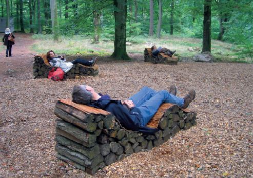 Jednoduché ležadlá z drevených siahovíc ako súčasť expozície v prírode poskytujú návštevníkom centra land-artu vo švédskom W